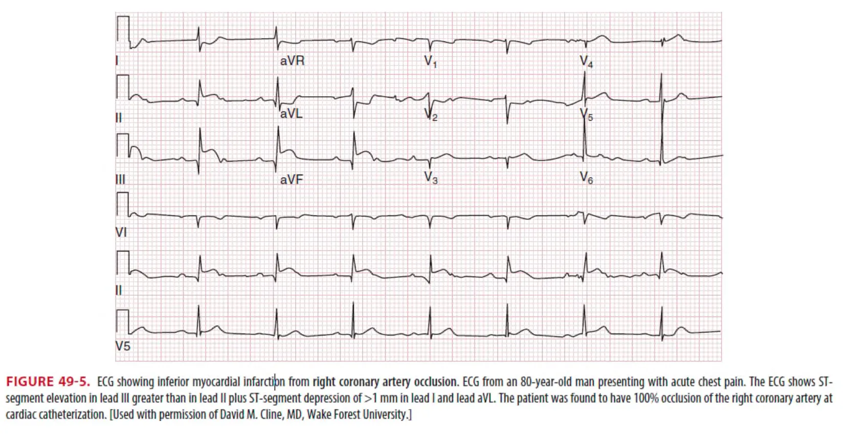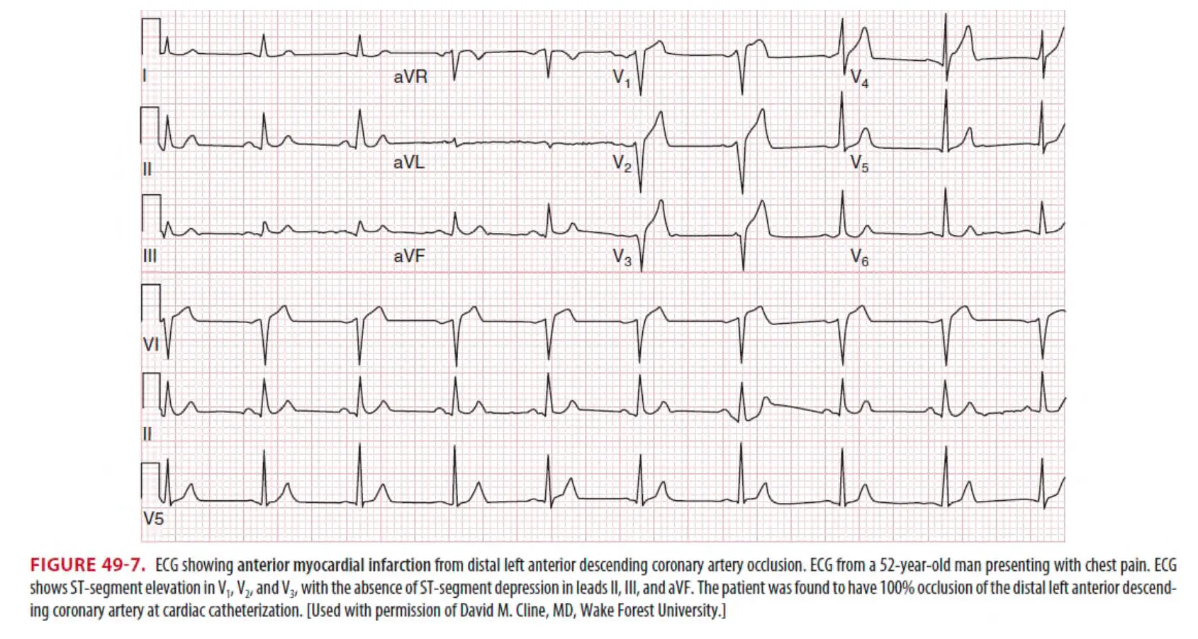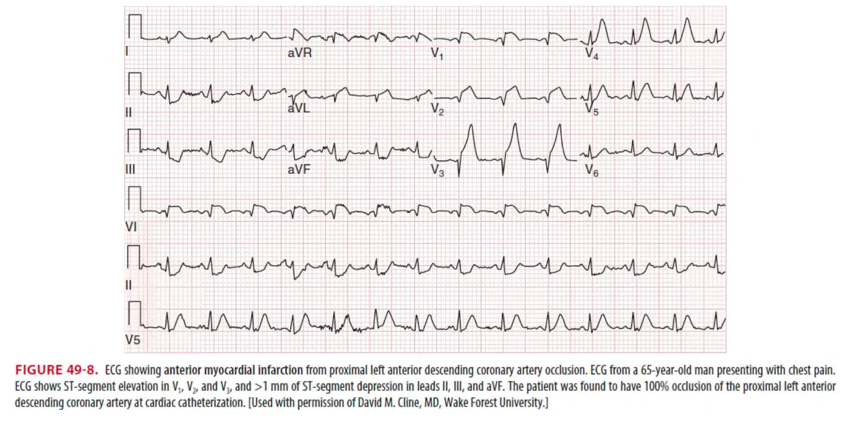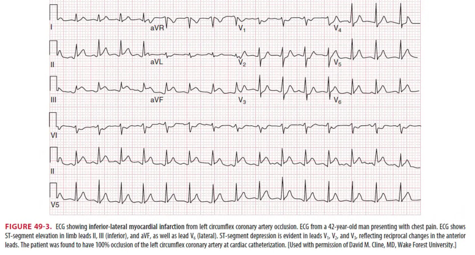 (4) AMI 의 1~5%, Unstable angina의 4~23%는 정상 또는 nonspecific한 ECG를 보일 수 있다. (5) Reciprocal ST 분절의 변화는 subendocardial ischemia로부터 생기며 넓은 범위의 손상을