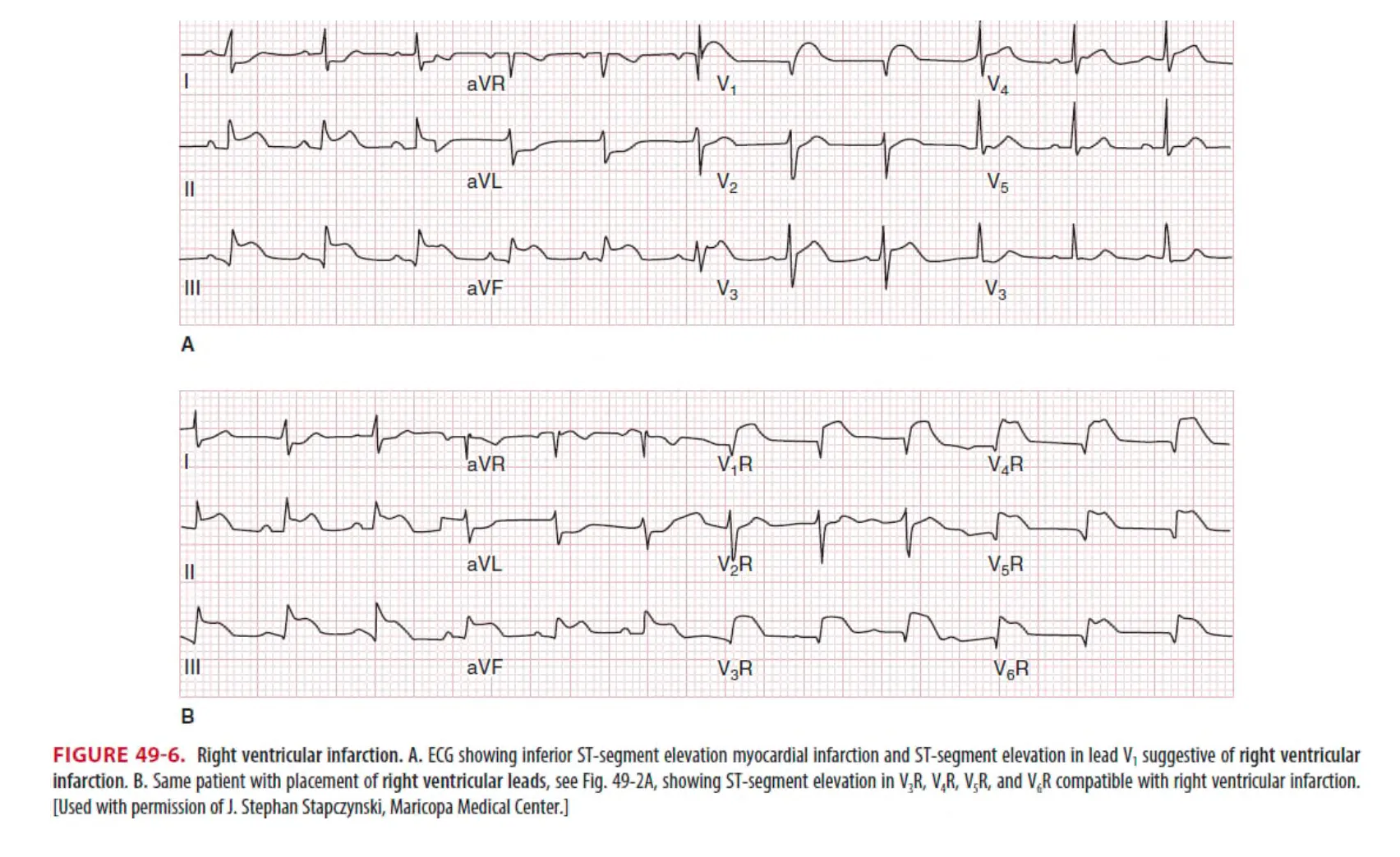 (2) Inf. wall AMI에서 Rt. sided lead V4(V4R)을 확인해야 하는데, V4R의 ST분절의 상승은 RV infarction을 강하게 시사하기 때문이다.