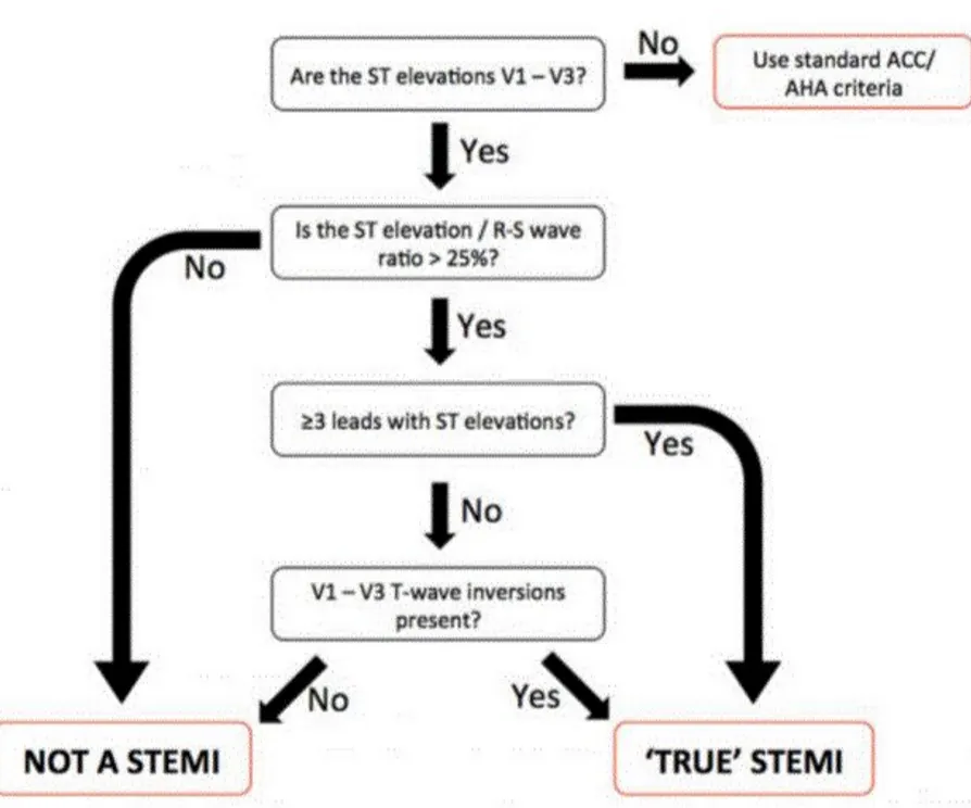 이의 개선을 위하여 2014년에 이뤄진 cohort연구의 결과에 따르면(Reference 1), patients with ECG LVH를 대상으로 STEMI 진단에 기존 ST elevation의 threshold를 정한 ACC/AHA criteria를 적용할 경우, sensitivity는 73%, specificity는 58%였다. Cohort data를 통해 얻어낸 criteria (사진1)을 적용 할 경우, sensitivity는 77%, specificity는 91%로 기존의 criteria에 비해 상승하였다. 해당 연구에 따르면, St segment elevation to R-S wave magnitude의 ratio가 LVH와 true stemi의 구분에 있어서 중요하다는 점을 새롭게 제시한다.