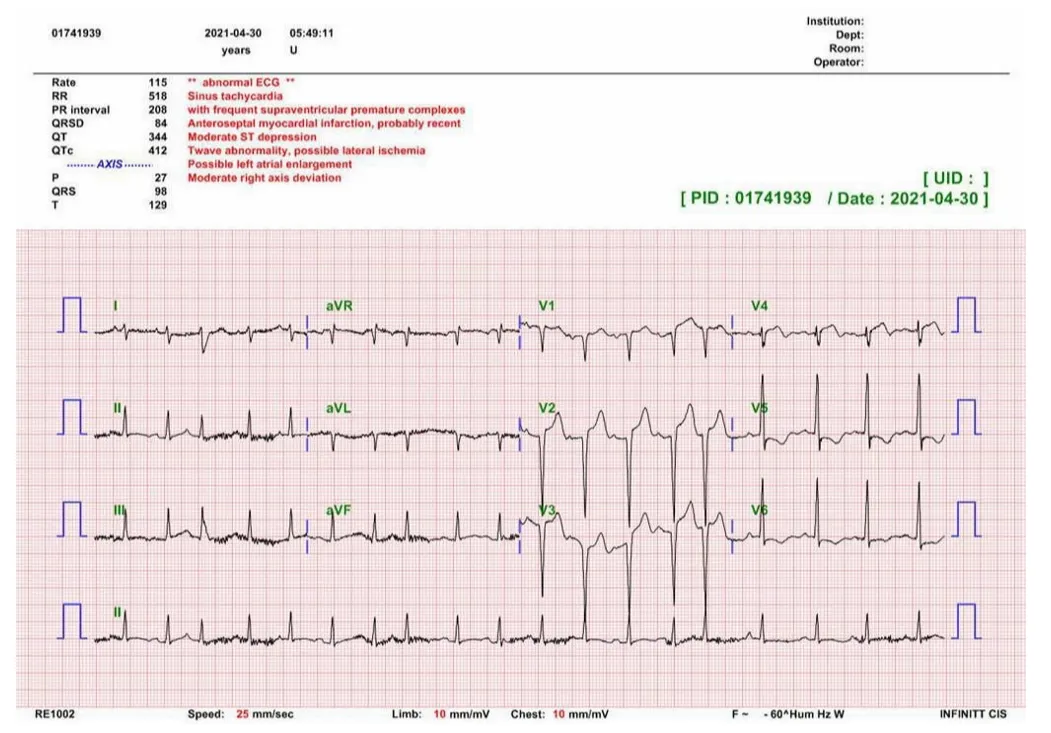 precordial lead, Lead 2,3에서 ST elevation 보이며 aVR depression 보임