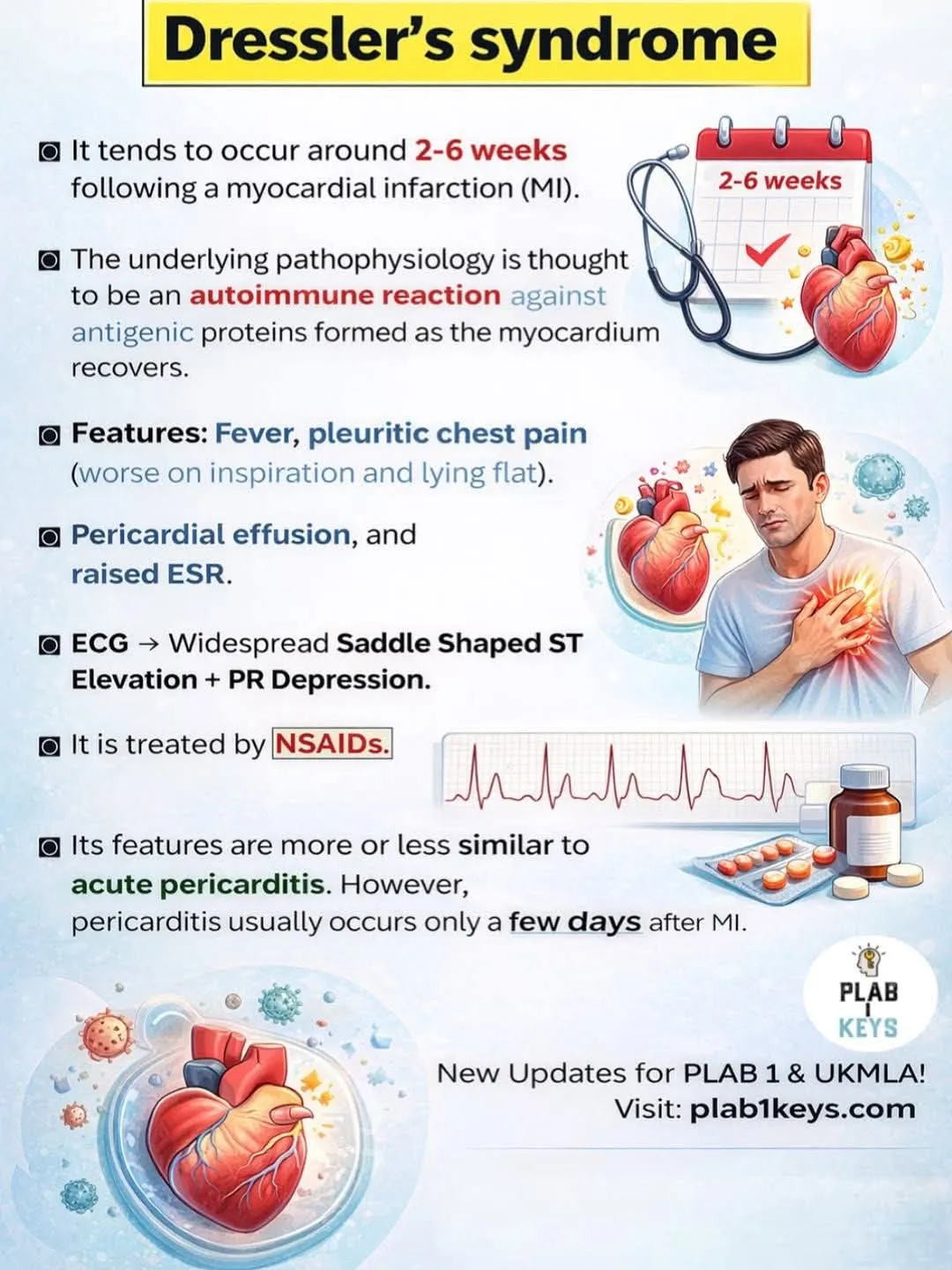 (1) AMI 후 2-10주 뒤에 발생하며 흉통과 발열, pleuropericarditis가 나타남
