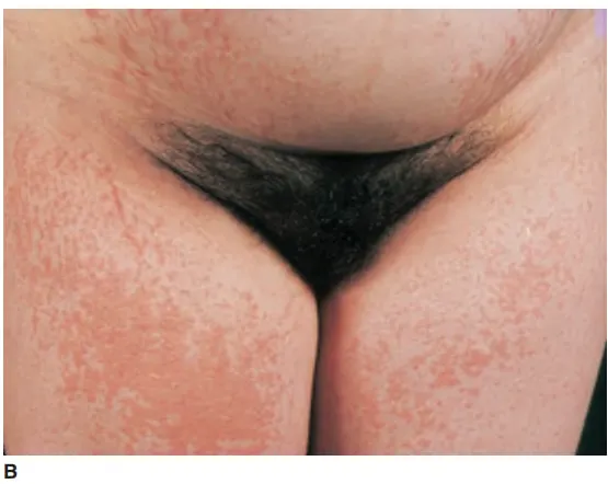① 극심하게 가렵고 홍반성 구진이 배의 튼 살 부위부터 시작해 번진다.