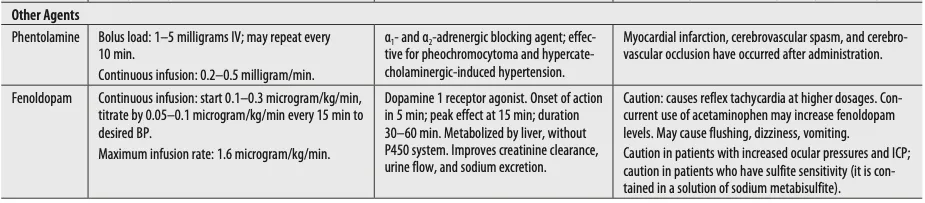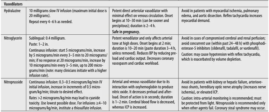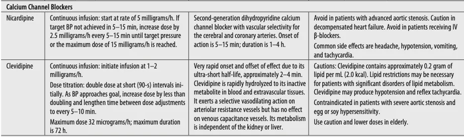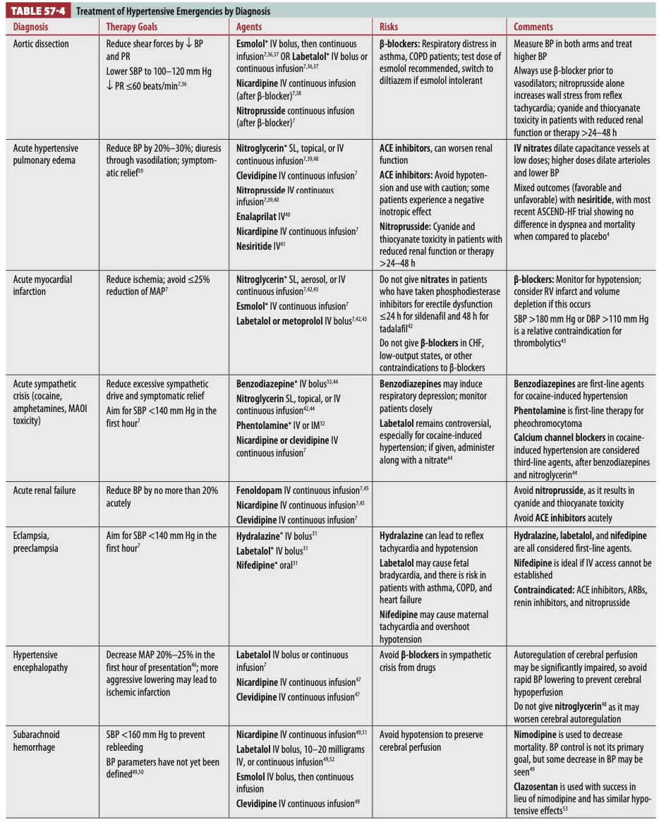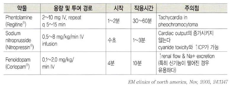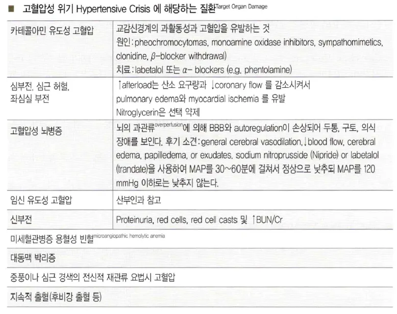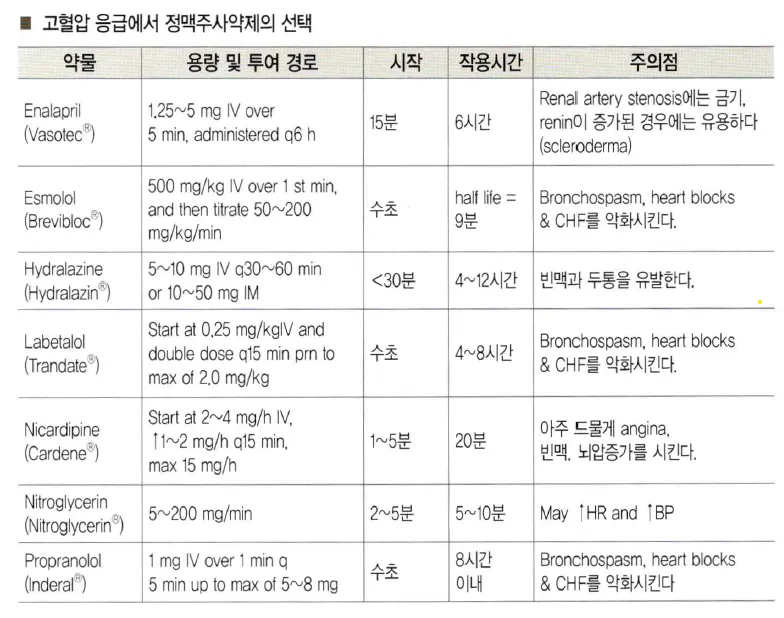 * Hypertensive emergency 질환, 혈압강하제와 관련된 내용이 Tintinalli 9th에 본문과 표로 정리되어 있음.