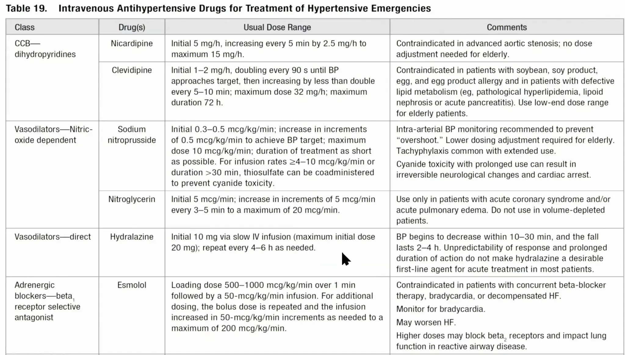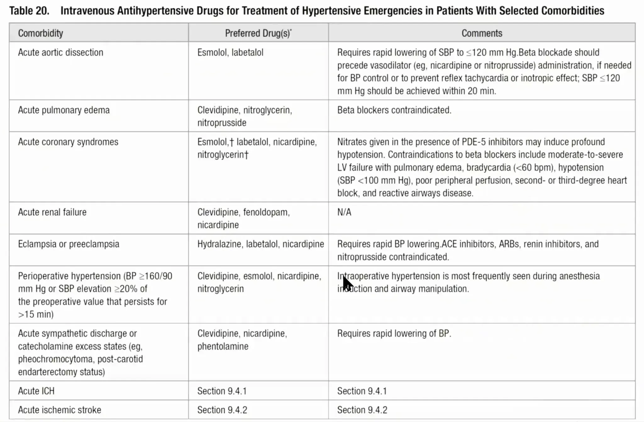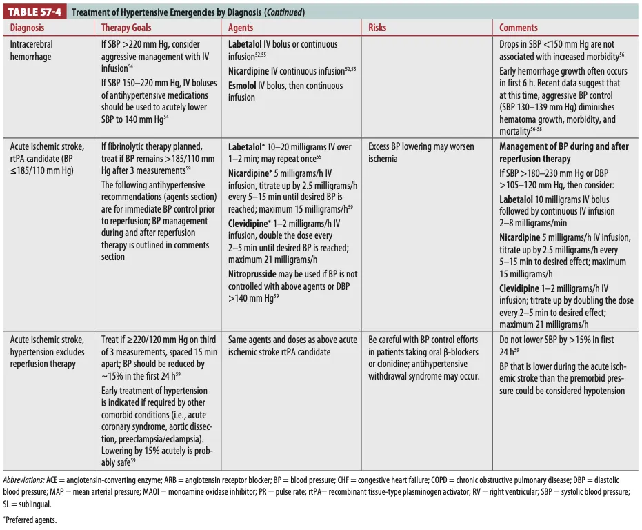 * Hypertensive emergency 질환, 혈압강하제와 관련된 내용이 Tintinalli 9th에 본문과 표로 정리되어 있음.
