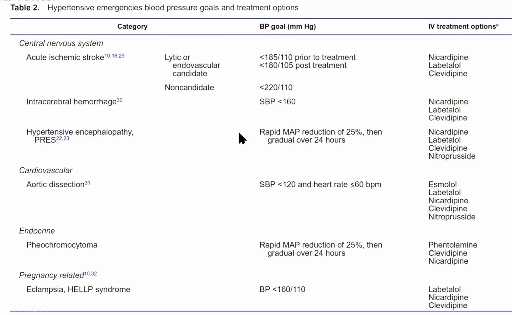 목표 혈압 : 첫 1시간내 - MAP 감소가 25% 이내로 낮춘다.