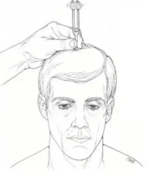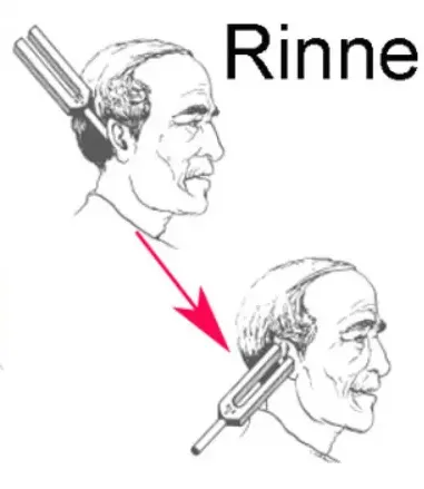 소리굽쇠를 mastoid process에 대고 소리가 안 들리면 귀에 가까이 대고 소리가 들리는지 확인한다.