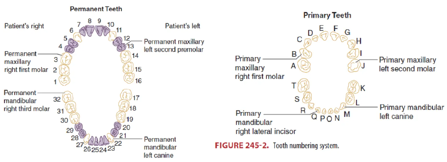 유치 20개 : 8 incisors, 4 canines, and 8 molars