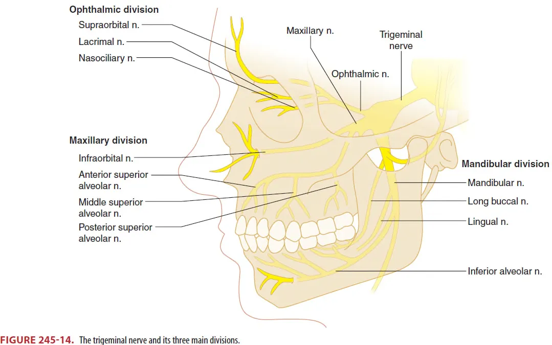 sensory n.이므로 local anesthesia 시에 그 해부학적 위치가 중요하다. (Fig 245-14)