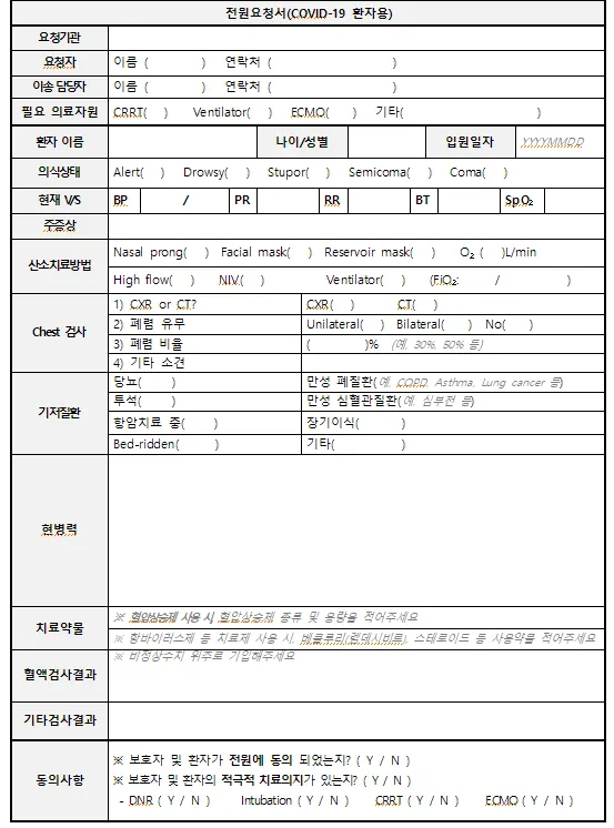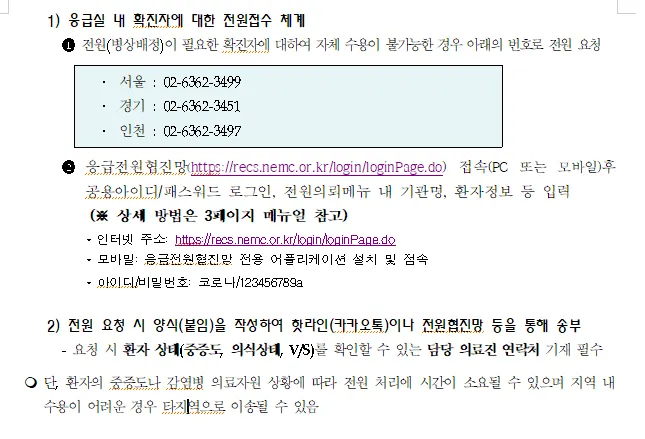 응급실 이용한 확진자에 대하여 전원이 필요한 경우 카카오톡 등을 통해 요청
