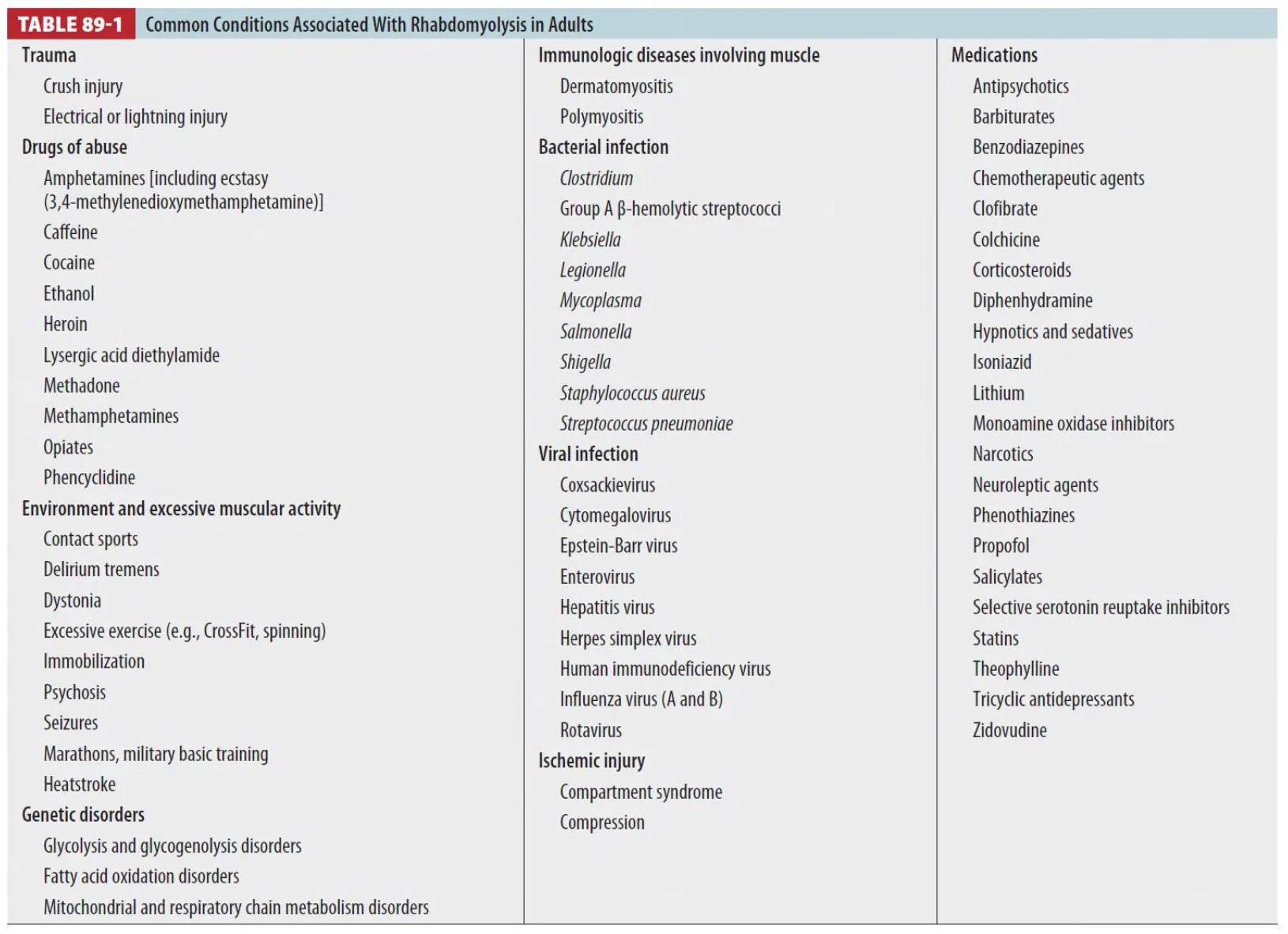 직접적인 근육 손상 및 유전학적 & 생화학적 인자들이 Rhabdomyolysis를 일으킬 수 있음.