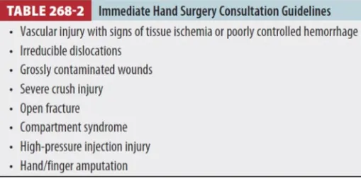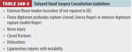 Table 268-3 : 수상 직후 repair하는 것이 가장 좋으므로 가능한 빨리 hand-specialist에게 협진