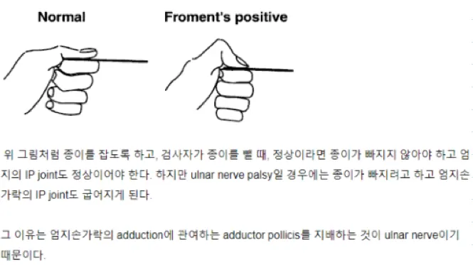 : 종이를 index PIP와 엄지 사이에 끼고 당겼을 때 엄지의 IP joint flexion 없이 유지가 되어야 함