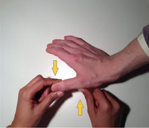 (2) Regional anesthesia 시행 후, metacarpal base에 longitudinal pressure을 가하면서 traction,