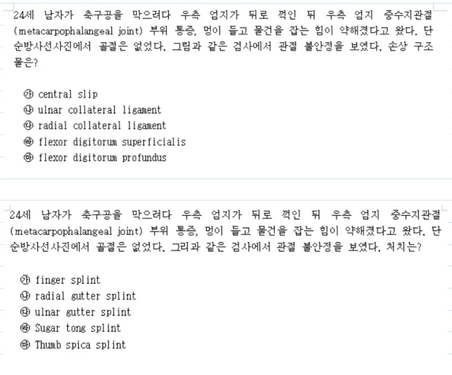 (2) MCP에 pain or ecchymosis, pinch에 weakness ulnar collateral ligament의 complete rupture
