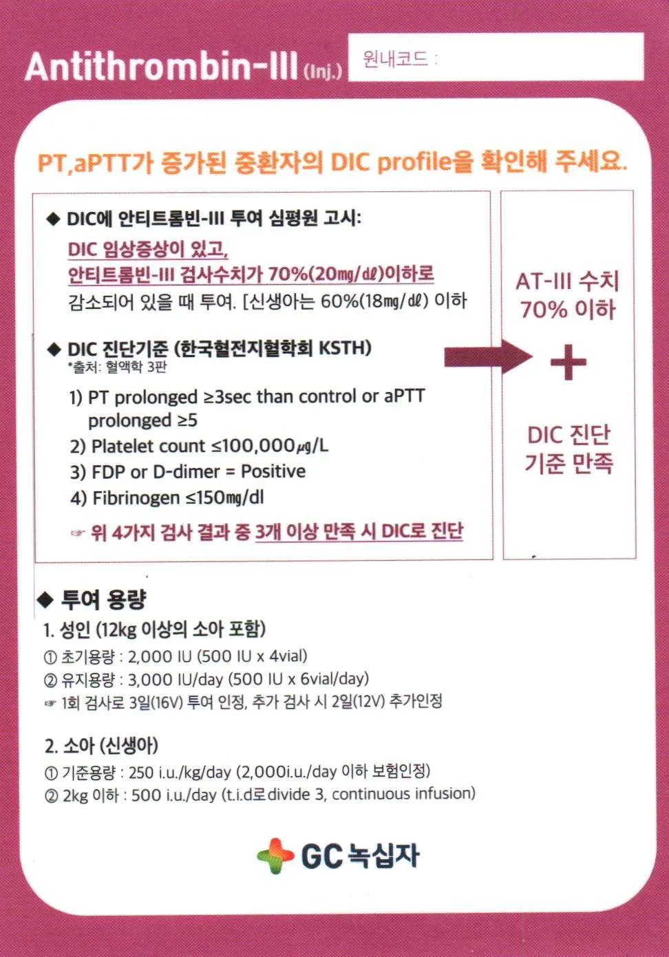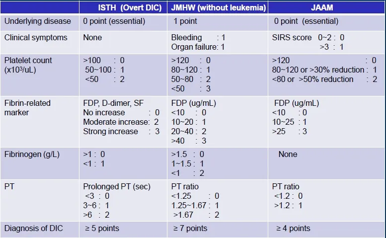 한국혈전지혈학회(KSTH) 진단기준 : 3가지 이상을 충족할 때 DIC로 진단.