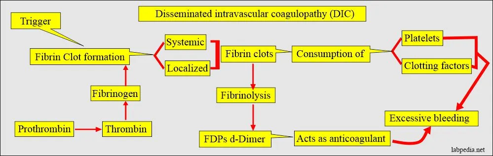DIC의 진단을 위해서는 트롬빈과 플라즈민 형성을 모두 반영하는 D-dimer 검사가 필요하다. 그런데 D-dimer 검사는 DIC에서 특징적으로 증가하지만 특정 질병에 특이한 검사는 아니다. 큰 혈관의 혈전증과 연부조직 혈종이 있는 환자에게도 양성반응이 나올 수 있다.